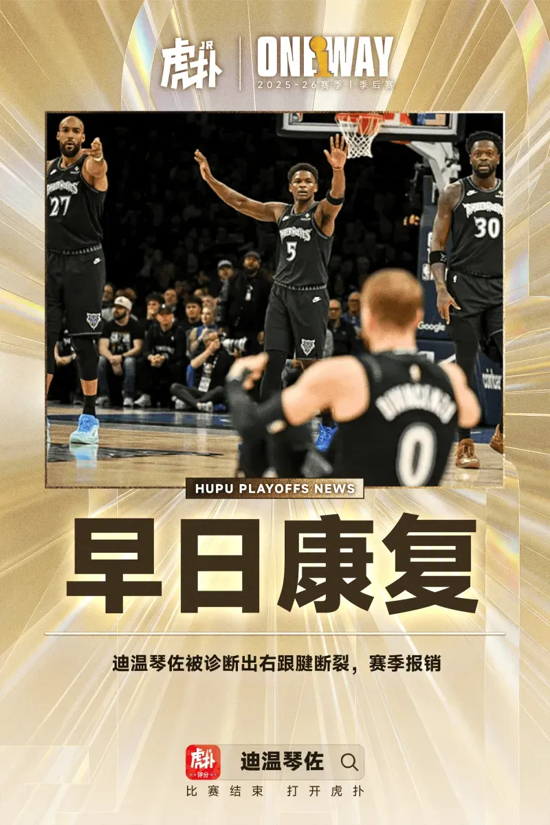 在季后赛首轮森林狼vs掘金G4的比赛开局阶段,森林狼后卫迪文琴佐在一次后脚向后发力蹬地的过程中不幸右腿受伤,仅登场1分19秒便伤退离场再没回归。据随后跟进报道:迪温琴佐被诊断出右跟腱断裂,赛季报销。
