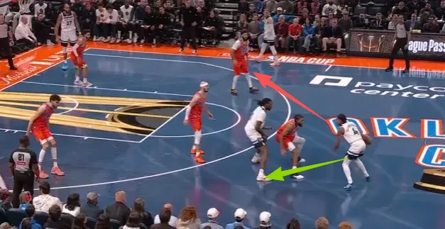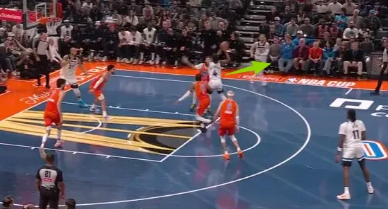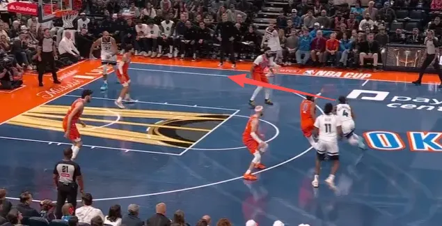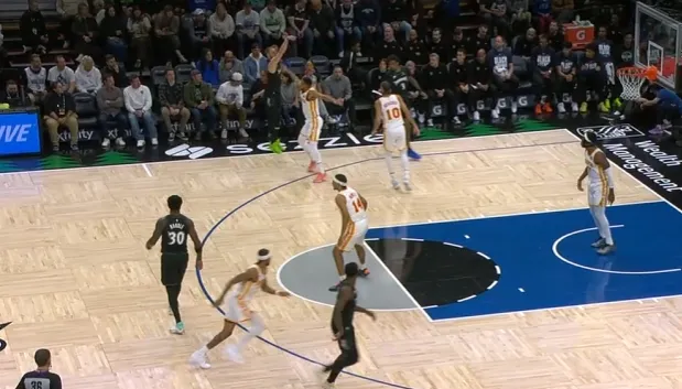 杰登左翼接球后立即与同侧底角上提的迪文发动边路手递手配合,迪文手递手接球后借助一丝投篮空间拔起就射,三分手起刀落。