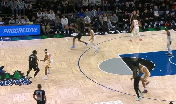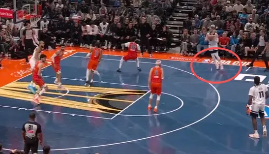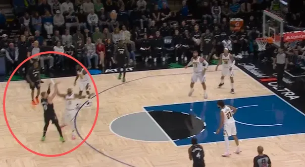 转换进攻回合海兰德持球过半场后立即传球找到拖车跟进至弧顶的迪文琴佐,迪文三分线外一步接球上步调整后直接拔起出手三分,一箭穿心。